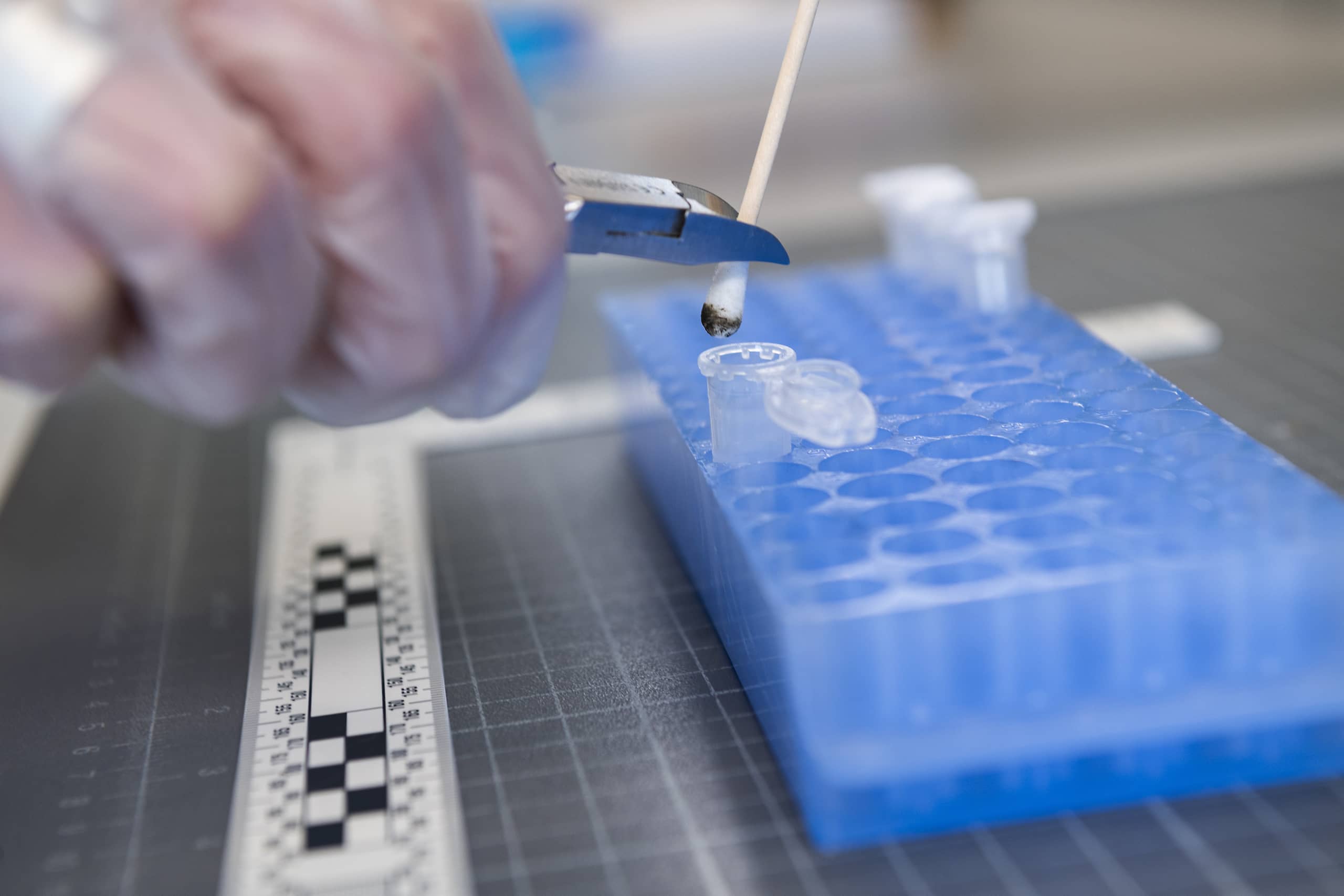 Deskundige onderzoekt bemonstering met wattenstaafje