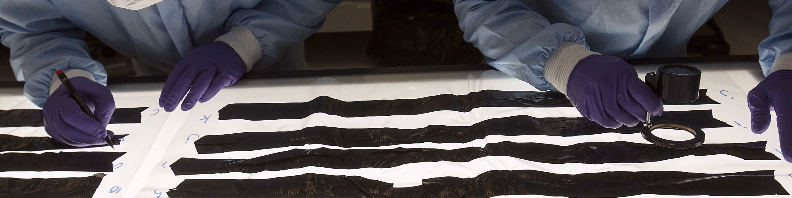 Om de scenario’s van het OM en de verdachte te toetsen, heeft Richard Visser, deskundige kras,- indruk,- en vormsporen (KIV) bij het NFI, alle stukken tape minutieus onderzocht. “Eerst heb ik het zogeheten ‘souche-onderzoek’ gedaan. Daarmee probeer ik antwoord te geven op de vraag of alle stukken tape van dezelfde rol afkomstig zijn en in welke volgorde de stukken aan elkaar vast hebben gezeten”, legt hij uit. Hij puzzelt de stukken letterlijk weer aan elkaar. Van begin tot einde, en dat is monnikenwerk. Zijn conclusie: alle stukken tape zijn inderdaad van één rol afgehaald. Ook achterhaalt hij de volgorde. Zo weet hij precies waar welk stuk tape op de rol heeft gezeten, voordat het slachtoffer werd vastgetapet.