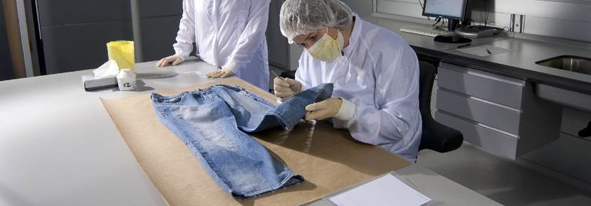 De onderzoeker maakt in eerste instantie gebruik van het blote oog en forensische lichtbronnen om te kijken of er menselijk celmateriaal aanwezig is.