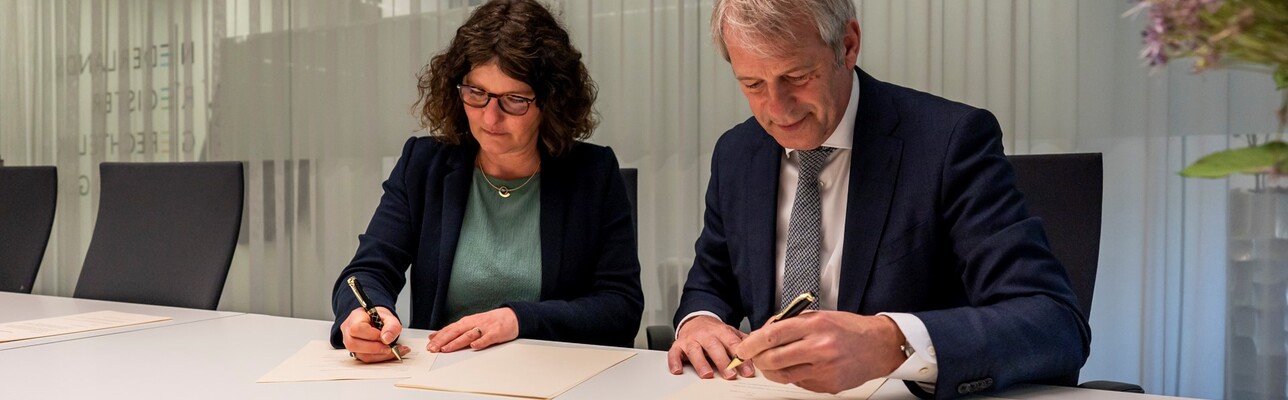 Annemieke de Vries en Eric Bakker ondertekenen documenten