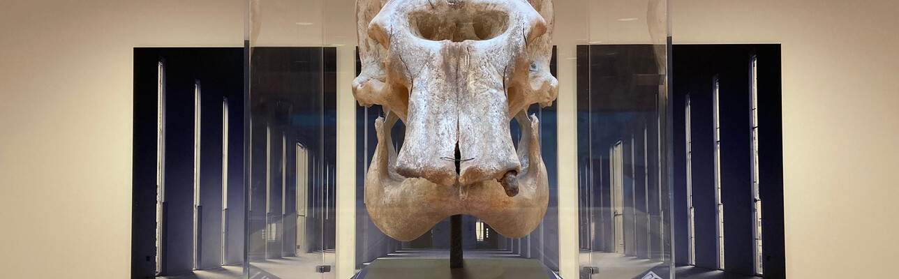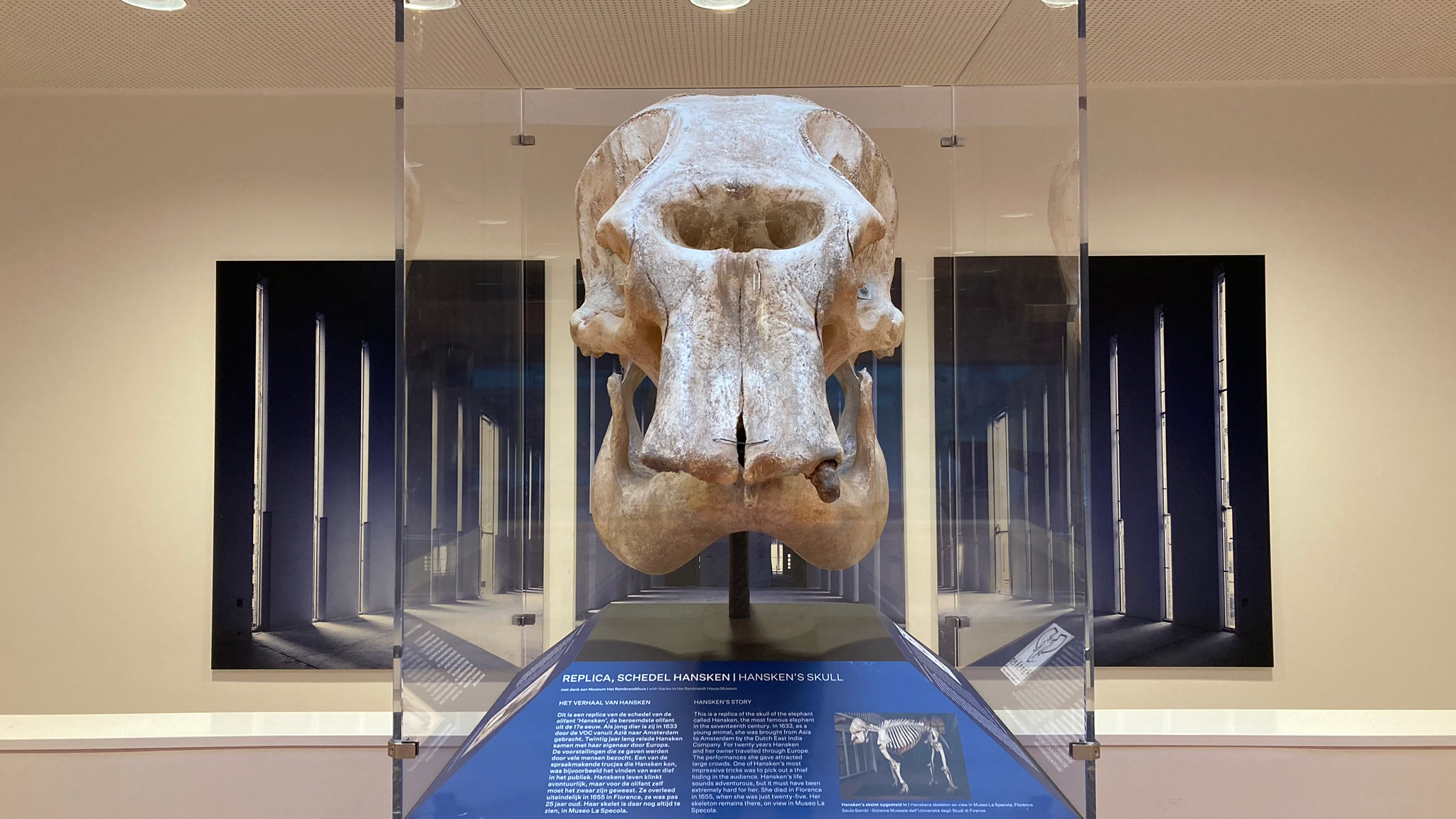 De olifantenschedel is geplaatst op de tweede etage van het NFI. De schedel is te zien in een grote vitrinekast, die het Rembrandthuis speciaal liet maken voor de echte schedel van de olifant. Het Rembrandthuis haalde deze schedel van Hansken vorig jaar uit Florence voor een tentoonstelling over het levensverhaal van de olifant (Hansken, Rembrandts olifant). Voor het natuurhistorisch museum La Specola in Florence liet het Rembrandthuis een replica van de schedel maken, die tijdelijk op het lijf van Hansken werd geplaatst. De oorspronkelijke schedel van Hansken is inmiddels weer terug in Florence. Voor de replica werd een nieuwe bestemming gezocht en dat werd het NFI, vertelt Hester Huitema van Museum Het Rembrandthuis. ‘Omdat wij klein behuisd zijn, zochten we een mooie plek waar de replica getoond kan blijven worden. Vanwege de connectie met Hansken benaderden wij het NFI en zij waren gelukkig direct enthousiast. Op deze manier wordt het verhaal van Hansken ook na onze tentoonstelling nog doorverteld,’ vertelt Huitema.