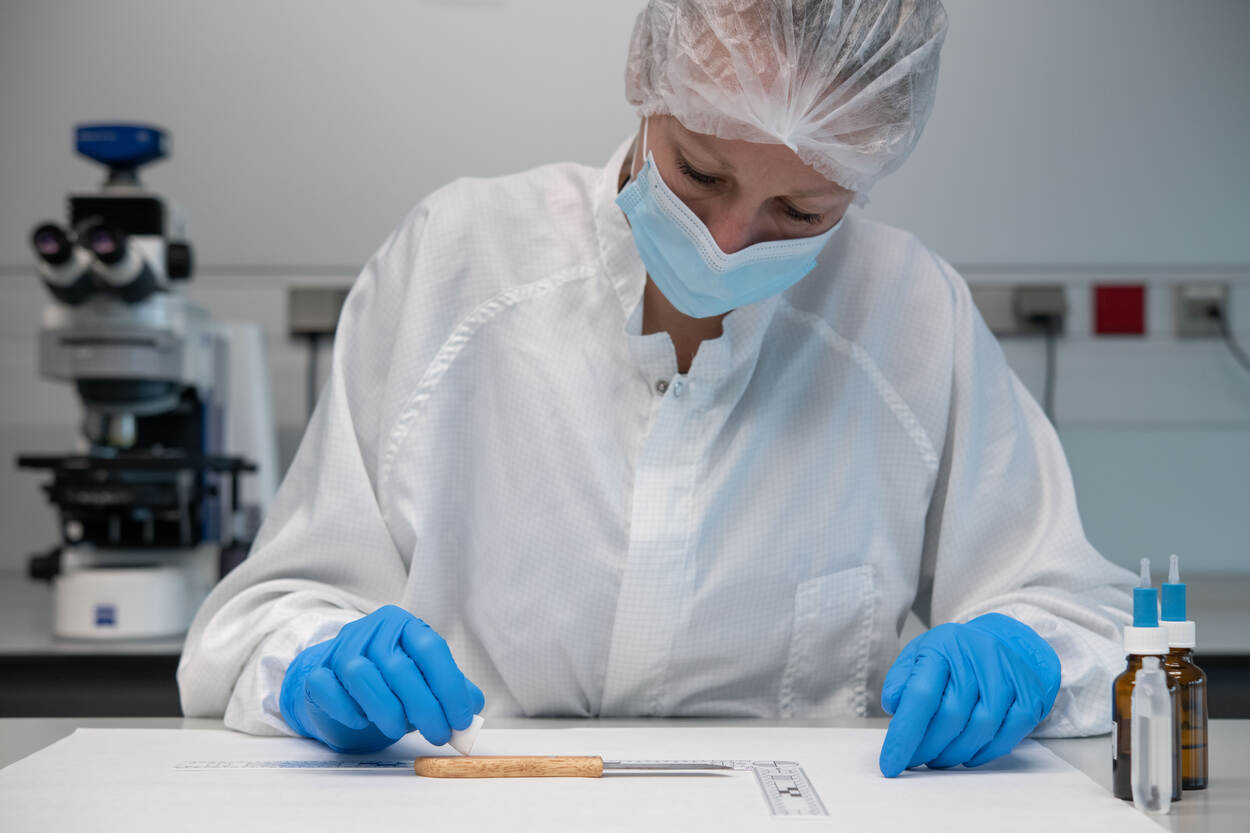 Onze DNA-onderzoekers werken met handschoenen aan. Ze hebben een haarnetje op en een mondkapje voor. Zo komen er geen sporen van de onderzoeker op het spoor dat ze hebben gekregen van de politie. Het is ook een hele kunst om sporen als haren of speeksel te vinden op kleding. Daarvoor worden sporenonderzoekers speciaal opgeleid.